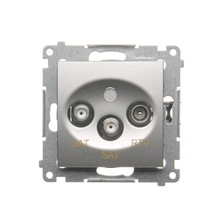 Srebrne gniazdo antenowe przeznaczone do podłączenia dwóch sygnałów SAT i jednego sygnału RTV. Idealne do rozbudowanych instalacji multimedialnych.