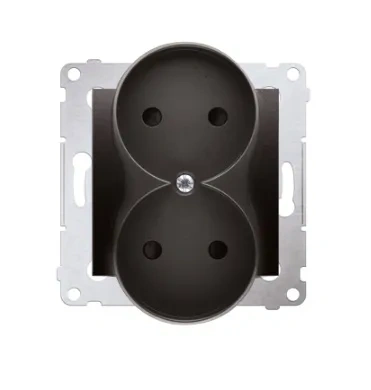 Podwójne gniazdo w czarnym, matowym wykończeniu przeznaczone do urządzeń niewymagających uziemienia. Przesłony torów prądowych zwiększają bezpieczeństwo codziennego użytkowania.