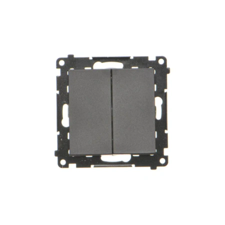 Podwójny łącznik schodowy z serii Simon 55 w czarnym matowym wykończeniu umożliwia sterowanie dwoma niezależnymi punktami świetlnymi z dwóch lokalizacji. Brak piktogramów nadaje mu uniwersalny i dyskretny wygląd.